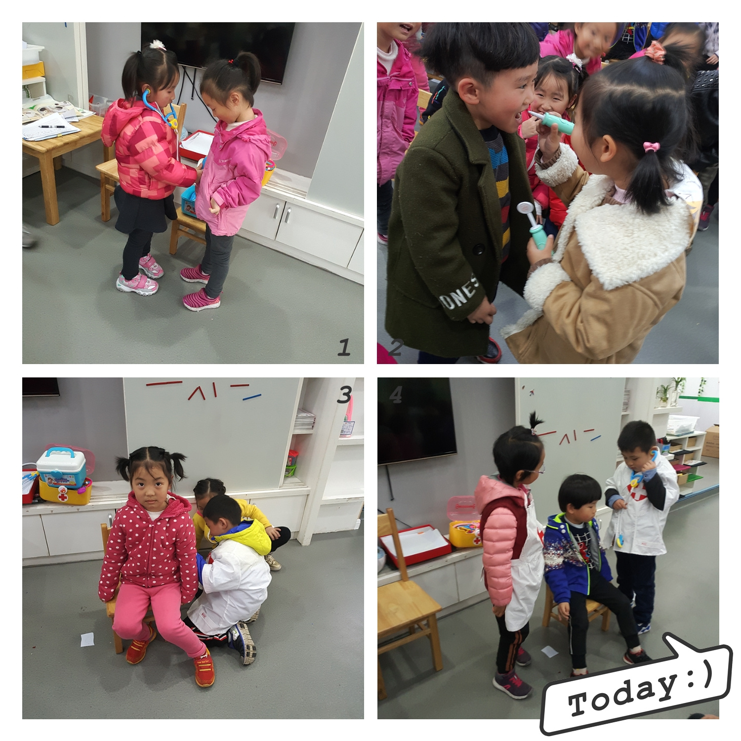 然后请小朋友上台来模仿医生是怎么看病的,打针的,还有的我们的护士也要帮助医生。