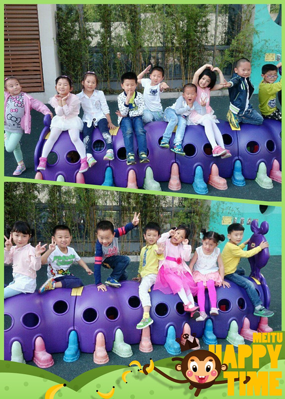 午后的户外活动时光,大家尽情游戏,毛毛虫是我们休息的好去处,聊聊天,玩玩游戏。幼儿园的生活真有趣!