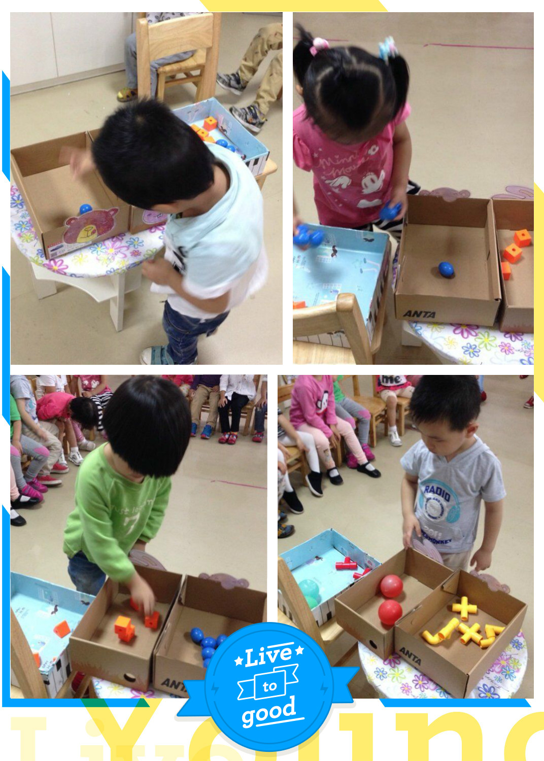 今天,我们学按玩具的颜色和形状分给小兔子和小熊,我们还认识了红、黄、蓝三种颜色和圆形、长方形、三角形哦~~